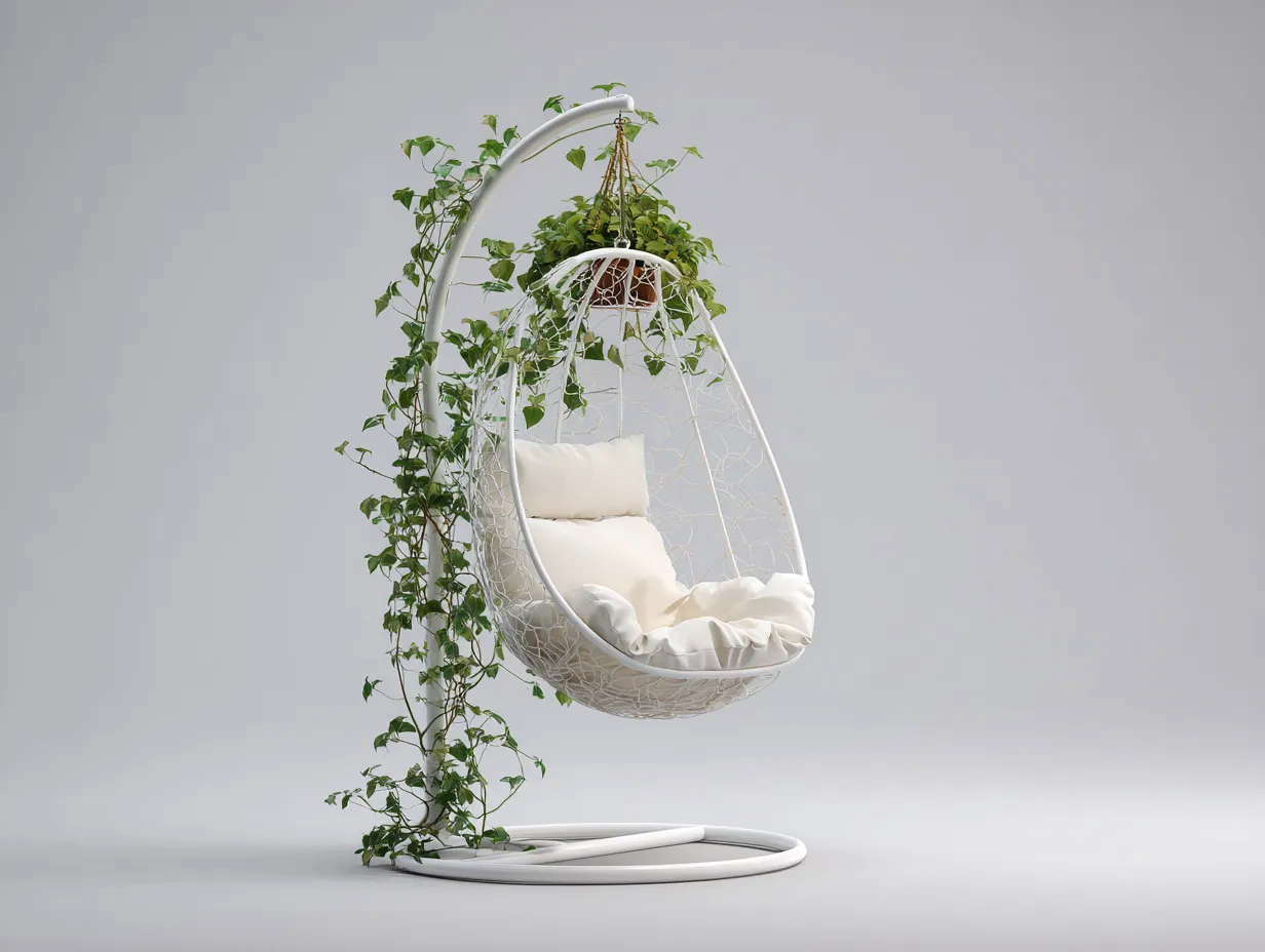 Die ergonomische Sitzform unterstützt den Körper bei längerer Nutzung. Das freistehende Gestell ermöglicht eine flexible Platzierung ohne feste Installation. Die offene Struktur sorgt für eine luftige und angenehme Nutzung.