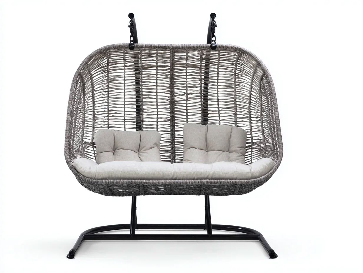 Die aufgehängte Sitzkonstruktion ermöglicht eine sanfte Schwingbewegung und unterstützt entspanntes Sitzen im Außenbereich. Die breite Sitzfläche bietet ausreichend Platz zum komfortablen Verweilen. Durch die stabile Standkonstruktion kann der Hängesessel frei im Garten oder auf der Terrasse positioniert werden.