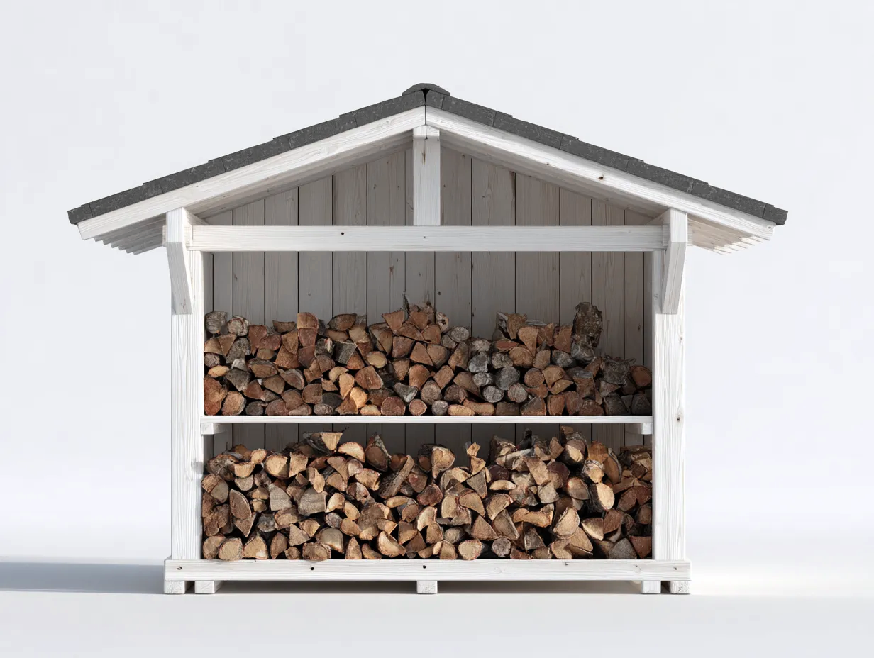 Das Kaminholzregal verfügt über eine geschützte Lagerfläche unter einem Dach, das vor direkter Witterung schützt. Die offene Vorderseite erleichtert den Zugriff und unterstützt eine gute Luftzirkulation. Die Bauweise ermöglicht eine strukturierte und platzsparende Nutzung.