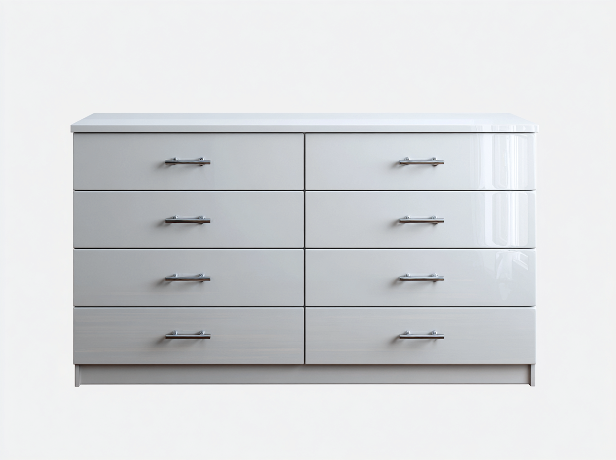 Das Möbelstück verfügt über acht Schubladen und bietet eine übersichtliche Aufteilung für unterschiedliche Gegenstände. Die Schubladen bieten ausreichend Stauraum für Kleidung, Accessoires oder Haushaltsartikel. Die obere Fläche kann zusätzlich als Ablage für Dekoration, Lampen oder persönliche Gegenstände genutzt werden.