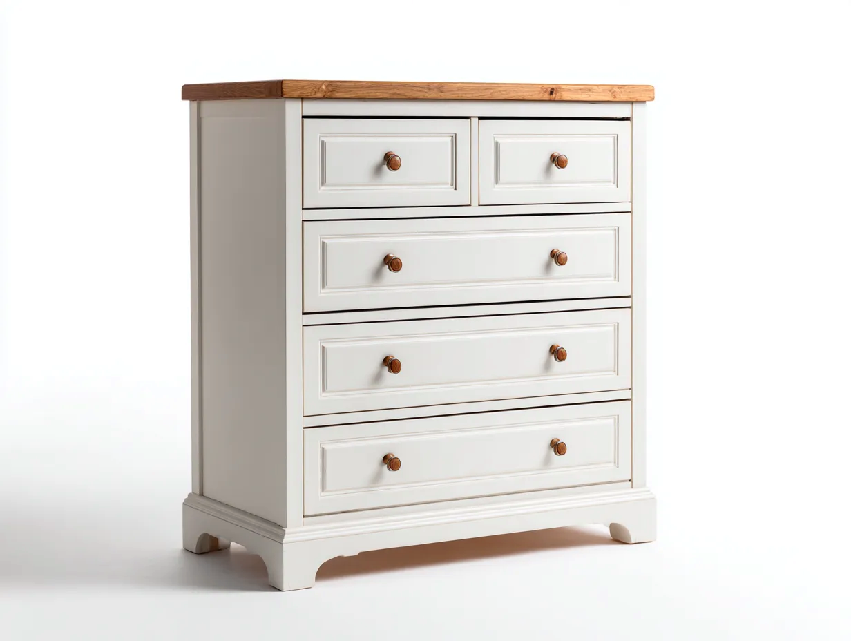 Diese Kommode mit Schubladen im Landhausstil überzeugt durch ihre kompakte Form und die harmonische Kombination aus hellen und natürlichen Farbtönen. Sie eignet sich ideal für Schlafzimmer, Flur oder Wohnbereich und schafft eine praktische sowie stilvolle Aufbewahrungslösung.