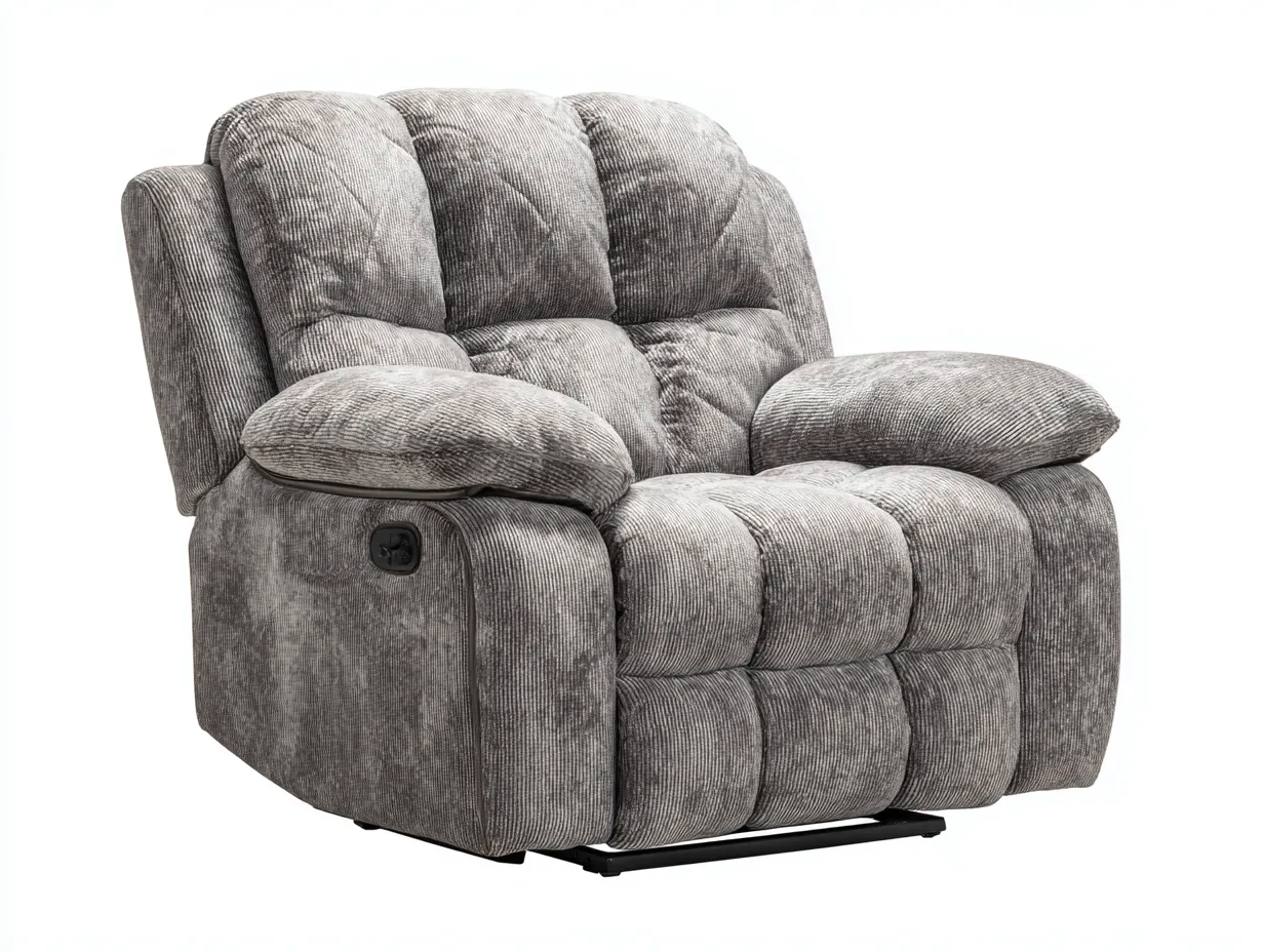 Der Bezug besteht aus strapazierfähigem Stoff in Grau mit angenehmer Oberflächenstruktur. Die stabile Funktionsmechanik basiert auf robusten Metallkomponenten. Großzügig gepolsterte Armlehnen, Sitz- und Rückenflächen sorgen für eine gleichmäßige Unterstützung und ein komfortables Sitzgefühl.